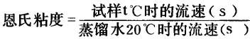 式中 ρV——体积电阻率(Ω·cm) U——测量电压(V) N——分流器的分流比 Cp——检流器的电流常数(A/mm) A——检流器的读数(mm) S——测量电极的表面积(cm2) D——测量电极与高压电极间距(cm) (九)折光率测定 测定要点:折光仪应放置在光线充足的地方。光与恒温水浴连接,再将折光仪棱镜温度调至实验温度。将样品数滴放入棱镜内,立即闭合,恒温后,调节棱镜之螺旋至现场分为明暗两部分。转动补偿器旋扭,消除彩虹并使明暗分界线清晰,继续调节螺旋并使明暗分界线对准在十字线上,读取标尺上的读数,读数精确至小数点以下4位。 注意:折光仪使用前应用水校正,20℃时水的折光率为1.3330。 (十)水分的测定(比浊法) 用增塑剂与溶剂相混,当含有水分时,将出现浑浊现象,由目视观察测定增塑剂的水分。 仪器、试剂参照GB1659-82。 方法一:称取1g试样(准确至0.01g)放入20ml带塞比色量筒中。在15~20℃下,将水饱和的苯20m1分4次加入,每次加入后剧烈摇动,然后观察其外观混浊程度,与同体积同温度水饱和苯比较。 方法二:取试样5ml,置于100ml带塞比色量筒中,在20℃下每次加入5ml汽油,剧烈摇动,直至100ml,每加入一次汽油察其外观的浑浊程度,并与同体积的汽油比较。 注意:一种增塑剂可任选一种测定方法。仲裁分析可用卡尔-费林法。 (十一)运动粘度测定(恩氏法) 恩氏粘度是在一定温度下试样自恩氏粘度计流出200ml所需时间(s)与同体积蒸馏水流出时间(s)之比值。 仪器:恩氏粘度计(见图),恩氏粘度计接受容量瓶(200ml),温度计,秒表。