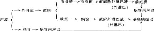 1.气传导(air conduction) 声波经外耳道的空气传导引起鼓膜的振动,在通过听骨链的蹬骨底板引起前庭窗的振动,进而引起前庭阶外淋巴液的振动,通过前庭膜引起蜗管内的内淋巴液振动,再引起基底膜的振动。此外鼓膜振动也可以引起鼓室内的空气振动,再引起蜗窗的振动,通过鼓阶中的外淋巴液的振动引起基底膜的振动。因为气导经过鼓膜和听鼓链的增音作用,所以气导是主要的传入途径,而听骨链途径是最重要的。