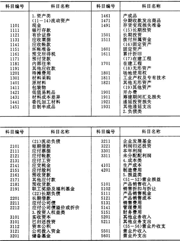附注: 1.上列会计科目,企业没有相应会计事项登记的,可以不设。 2.企业可以根据实际需要增设下列会计科目: (1)采用定额备用金制度的企业,增设“1155备用金”科目。 (2)采用实际成本进行材料核算的企业,不设“1301材料采购”科目,改设“1302在途材料”科目。 (3)采用计划成本进行自制半成品和产成品核算的企业,增设“1452自制半成品成本差异”和“1462产成品成本差异”科目。 (4)按完工进度或实际完成的工作量确定销售收入实现的企业,增设“4301已转未完工生产成本”科目。 (5)委托其他单位代销(不包括包销)产品的企业,增设“1472委托代销商品”;有外购商品,不经加工即行对外销售的企业,增设“1481外购商品”科目。 (6)企业的固定资产因报废、毁损等原因需要清理的,增设“1621固定资产清理”科目。 (7)有按融资租赁方式租入固定资产的企业,增设“1631融资租入固定资产”科目。 (8)有将应收票据向银行贴现的企业,如果应收票据不属于银行承兑的,增设“1135应收票据贴现”科目。 (9)企业可将“4101生产成本”科目分为“4102基本生产”科目和“4103辅助生产”科目;可将“4201制造费用”科目分为“4202车间经费”和“4203厂部经费”科目。 (10)有购入外汇额度的企业,可增设“1116购入外汇额度”科目。 (11)企业解散清算时,为了计算清算过程中发生的费用及清算损益。可增设“5701清算费用”科目和“5801清算损失”科目。 3.企业还可以根据具体情况,设置一些备查科目,如“受托加工材料”、“受托代销商品”、“可用外汇额度(按原币记帐)”、“租入固定资产”(不包括融资租入固定资产)等。 |