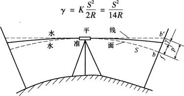图2-25 地球曲率和大气折光的影响 (2)大气折光引起的误差 水平视线经过密度不同的空气层被折射后,一般情况下会形成向下弯曲的曲线,它与理论水平线的读数之差,就是由大气折光引起的误差γ(图2-25)。实验得出:大气折光误差比地球曲率误差要小,是地球曲率误差的K倍,在一般大气情况下,K=1/7,故: 所以,水平视线在水准尺上的实际读数位于b′,它与按水准面得出的读数b之差,就是地球曲率和大气折光总的影响值f。故: