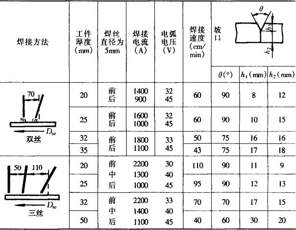 | 释义 | 多丝埋弧焊工艺 多丝焊是提高生产率、改善热循环的一种埋弧焊方法。常用的有双丝和三丝,为了特殊需要,焊丝可多至14根,甚至更多。用双丝或三丝时,每根焊丝单独供电,更多的焊丝可分组供电。熔深主要靠前导电弧,后续电弧主要起调节熔宽和改善成形的作用。为此焊丝之间的距离和角度应严格控制,其规范参数见表4-11b。 表4-11b 多丝单面埋弧焊参考规范