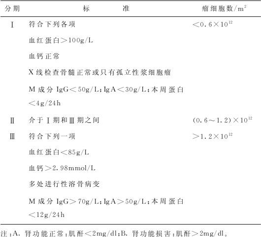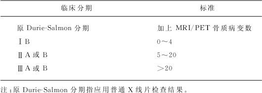 | 释义 | 多发性骨髓瘤 (一)概述 多发性骨髓瘤(multiple myeloma,MM)是浆细胞异常增生的恶性疾病,异常浆细胞(骨髓瘤细胞)浸润骨骼和软组织,产生异常单克隆免疫球蛋白(M蛋白)或免疫球蛋白片段,引起骨骼破坏、贫血、肾功能损害,而正常浆细胞分泌免疫球蛋白减少致免疫功能异常。 多发性骨髓瘤是原发于造血系统的恶性克隆性浆细胞病,发病率在恶性血液系疾病中仅次于淋巴瘤、白血病而居第3位。MM是中老年人疾病,几乎不发生于青少年。临床表现以贫血、骨痛、易发生感染为主要特征。MM属难治性疾病,预后不良。 (二)病因和发病机理 目前尚未完全阐明,以往的动物实验研究表明可能与遗传有关。淋巴巨噬细胞系统不断受到理化及生物原等慢性刺激(包括细菌、病毒),可能是浆细胞病的主要致病因素。此外,与IL—6生成失调引起浆细胞异常增生有关。MM患者的正常多克隆性免疫球蛋白合成与分泌受到抑制,表现为异常的单克隆免疫球蛋白大量增加,而正常免疫球蛋白显着减少。患者的免疫力明显下降,导致感染发生,肺炎最常见,其次是泌尿系感染。 (三)临床表现 MM的临床表现多样,在不同类型、不同病期及不同患者中,症状不同。典型表现是中老年发病,有贫血、骨痛(胸腹背痛最为多见)及反复感染(肺部感染最为常见)。此外,可有肾脏损害(多尿或少尿、蛋白尿、水肿)、高黏滞综合征(头晕、视力障碍、肢体麻木、肾功能不全、昏迷等)、高钙血症(头痛、呕吐、多尿、心律失常、昏迷等)以及淀粉样变性。胸椎或腰椎病理性骨折可造成截瘫。体征有皮肤黏膜苍白、舌体肥大、受累骨骼压痛及活动障碍、肝脾肿大、水肿等。 (四)诊断 1.病史 中老年人有不明原因的贫血、骨骼疼痛或反复感染。部分患者的首发症状为肾功能损害。 2.体格检查 骨骼压痛和活动受限是重要体征。贫血(皮肤黏膜苍白)、舌体肥大(淀粉样变性)也是常见的体征。约半数患者肝脏肿大,约20%患者脾脏肿大。 3.实验室检查 对MM的诊断有决定性意义。骨髓穿刺发现有骨髓瘤细胞。血清蛋白电泳、免疫电泳证实有单克隆免疫球蛋白或单克隆免疫球蛋白轻链。X线检查显示受累骨骼普遍性骨质疏松和(或)溶骨性病变。此外,红细胞沉降率显着增快、血钙升高、血尿酸增多、血液黏滞性增高、β2微球蛋白增多、肾功能不全以及淀粉样变性都可见于本病。 (五)诊断标准 1.国内诊断标准 (1)骨髓中浆细胞>15%并有原浆或幼浆细胞,或组织活检证实为浆细胞瘤。 (2)血清单克隆免疫球蛋白(M蛋白)IgG>35g/L,IgA>20g/L,IgM>15g/L,IgD>2g/L,lgE>2g/L;尿中单克隆免疫球蛋白轻链(本周蛋白)>lg/24h。 (3)广泛骨质疏松和(或)溶骨病变。 符合第(1)和第(2)项即可诊断MM,符合上述所有3项者为进展性MM。诊断IgM型MM时,要求符合上述所有三项并有其他MM相关临床表现。符合第(1)和第(3)项而缺少第(2)项者,属不分泌型MM,应注意除外骨髓转移癌,若有可能应进一步鉴别属不合成亚型抑或合成而不分泌亚型。 2.国外诊断标准 (1)世界卫生组织(WHO)2001年公布了MM诊断标准。 1)MM的诊断需具备下列1项主要指标和1项次要指标,或者具备下列3项次要指标,但其中必须包含第①项和第②项次要指标,而且患者应有MM相关临床表现。 2)主要诊断指标 ①骨髓中浆细胞增多>30%。 ②活检证实为浆细胞瘤。 ③M成分:血清IgG>35g/L;IgA>20g/L;尿本周蛋白>1g/24h。 3)次要诊断指标 ①骨髓中浆细胞增多10%~30%。 ②M成分存在但水平低于主要诊断指标。 ③有溶骨性病变。 ④正常免疫球蛋白减少(正常<50%):IgG<6g/L;IgA (2)WHO同时还制订了冒烟型骨髓瘤(smoldering myeloma,SMlM)和惰性骨髓瘤(indolent myeloma,IMM)的诊断标准。 1)WHO诊断SMM标准 ①血清M蛋白水平达到诊断MM水平。 ②骨髓中浆细胞10%~30%。 ③无溶骨性病变。 ④无骨髓瘤相关症状。 2)WHO诊断IMM标准 ①骨髓中浆细胞>30%或活检证实为浆细胞瘤。 ②血清M蛋白IgG<70g/L或IgA<50g/L。 ③溶骨性病变≤3处且无压缩性骨折。 ④血红蛋白、血钙、肌酐水平正常。 ⑤无感染。 (3)MM临床分期标准:临床分期反映MM病程早晚和肿瘤负荷,与治疗及预后有关,故当MM的诊断确定之后,应进一步明确患者的临床分期。自20世纪70年代以来临床上广泛采用的Durie和Salmon分期标准目前仍在沿用(表5—10)。 表5—10 Durie—Salmon分期标准 近年来,影像学有了长足进步,MRI、PET、PET—CT在检测骨质病变上远较普通X线片敏感。因此,Durie在原来Durie—Salmon分期标准上加入了上述影像学检查,制订了Dutie—Salmon Plus分期标准并发表于2006年(表5—11)。 表5—11 Durie—Salmon Plus分期标准 (4)近年来众多研究证明β2微球蛋白(β2—m)和白蛋白水平对MM的临床分期和预后有关键意义。 国际骨髓瘤基金会(international myeloma Foundation)25位专家根据对10750例患者资料的荟萃分析,于2005年提出了最新MM国际分期标准(ISS)。 Ⅰ期:β2微球蛋白<3.5mg/L,白蛋白>3.5g/L。 Ⅱ期:介于Ⅰ期和Ⅲ期之间。 Ⅲ期:β2微球蛋白>5.5mg/L。 (六)鉴别诊断 1.MM是最易被误诊的疾病之一,据国内研究发现误诊率高达60%以上。其原因有3种:①缺乏有关MM的专业知识或缺乏对MM的謦惕性;②MM的临床表现多样而不具特异性;③缺乏实验室检查设备(如蛋白电泳、免疫电泳、轻链定量等)。其中第一条原因最关键。遇到可疑病例,做蛋白电泳、骨髓穿刺,则可避免误诊或漏诊。 2.老年患者发生原因不明的反复肺部感染,或有不明原因的红