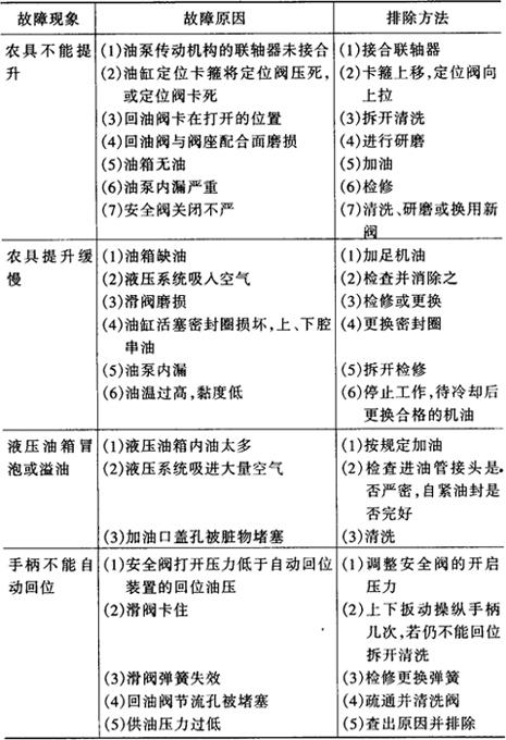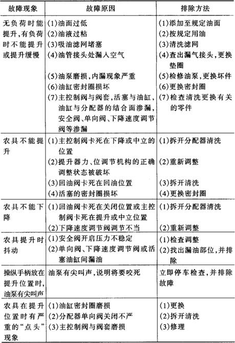 表4-9 拖拉机整体式液压悬挂系统常见故障及排除