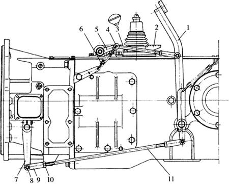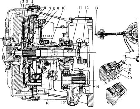 图4-48 铁牛拖拉机离合器(单位:mm) 1.前从动盘总成 2.前压盘 3.后从动盘总成 4.后压盘 5.离合器盖 6.紧固螺栓 7.调节螺母 8.分离拉杆 9.分离杠杆 10.分离滑套总成 11.动力输出离合器主动轴 12.主离合器轴 13.润滑油嘴 14.动力输出离合器从动轴 15.动力输出离合器从动齿轮 16.拨动叉 17.支撑螺栓 18.支撑螺栓垫片 19.支撑螺栓座 20.挡销 (2)外部调整:松开拉杆11(图4-49)上的锁紧螺母10,取下连接销8,拧动调节叉9,使踏板自由行程达到规定值,然后装合。当利用这种方法不能调到其规定值时,须进行内部调整。