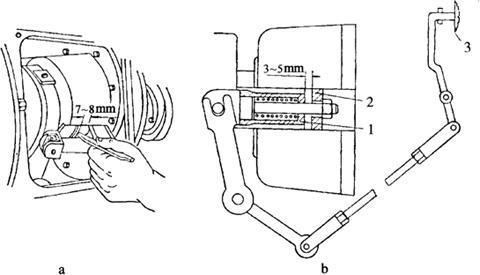 图4-49 铁牛拖拉机离合器操纵机构 1.离合器踏板 2.分离定位销踏板 3.连锁拉杆 4.轴销 5.连锁轴臂 6.拉簧 7.拨动叉轴臂 8.连接销 9.调节叉 10.锁紧螺母 11.拉杆 2.离合器分离行程的调整 对于双作用离合器,为了保证离合器接合和动力输出及离合器的分离彻底,必须使3个挡销20(图4-48)的端面和3个支撑螺栓17的端面之间的间隙保持在规定值,过大过小都会使离合器不能正常工作。 调整时,把3个支撑螺栓17拧到顶住挡销20的端面为止,然后再分别将支撑螺栓退回9个卡槽(可以听到9次响声),此间隙就是规定数值。 3.东方红75、802型拖拉机离合器小制动器间隙的检查调整 当离合器处于接合状态时,检查制动压盘与制动盘之间的间隙应为7~8mm,如图4-50a所示。可用塞规进行测量,如间隙不正确,可改变离合器拉杆的长度进行调整。拉杆增长,间隙增大;反之减小。当离合器处于分离状态时,检查耳环后端面与制动压盘之间的间隙,应为3~5mm,如图4-50b所示。此间隙用改变螺栓的有效长度调整。小制动器间隙调好后,应调离合器间隙(只能采用内部调整法)。