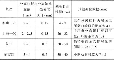 图4-50 东方红-75型拖拉机离合器小制动器间隙调整 a.离合器接合 b.离合器分离 1.耳环 2.制动压盘 3.踏板 常用拖拉机离合器主要调整数据见表4-2。 表4-2 常用拖拉机离合器主要调整数据