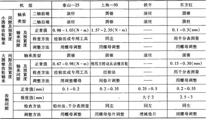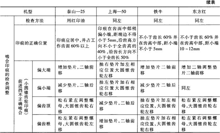 图4-51 圆锥齿轮的正确啮合 1.大小圆锥齿轮轴承间隙及预紧度的检查 将千分表的表头顶触在大小圆锥齿轮的端面上,用撬棒沿轴向撬动齿轮,千分表指针摆动量就是轴承间隙。测量大圆锥齿轮轴承预紧力时,拆下小圆锥齿轮及两边半轴,用专用工具转动大齿轮,测出转动所需的扭矩,如扭矩符合规定,轴承紧度即符合要求。测量小圆锥齿轮轴承紧度时,应将小圆锥齿轮总成夹在虎钳上,用专用工具测量转动小圆锥齿轮所需转矩,如转矩符合要求紧度即合适。 2.啮合印痕的检查 由于前进挡工作时间长,负荷重,所以检查或调整啮合印痕,应以前进挡工作齿面的啮合印痕为准,在此前提下,适当照顾倒退挡工作齿面的啮合印痕。检查前,首先应弄清哪一面是前进挡工作齿面。 检查时,应先放净润滑油,并洗净擦干齿轮表面,然后将红印油或红丹油涂在齿面上,在稍加制动的情况下,转动圆锥齿轮副,使工作齿面得到清晰的印痕。观察或测取印痕的位置和尺寸。如果印痕不符合要求,应予调整。 3.齿侧间隙的检查 齿侧间隙过小,会造成圆锥齿轮副润滑不良,后桥温度过高,加速齿面磨损,甚至传动卡滞或产生啃齿现象,使轮齿折断;间隙过大,则产生较大的冲击,甚至造成轮齿崩裂。因此,调好印痕后,必须检查齿侧间隙。检查可采用下列两种方法: 第一种方法是将千分表架固定好,用表头垂直顶触在小圆锥齿轮大端齿面上,然后用手晃动小圆锥齿轮轴,表针的摆差即为齿侧间隙。 第二种方法是将适当粗细的保险丝弯成“∽”形或“匚”形作为试片,将此试片放入即将啮合的非工作面上,位置应与啮合印痕相对应。转动圆锥齿轮副,取出保险丝,用游标卡尺测量被挤压后的最薄处厚度,即为齿侧间隙。 无论采用哪种方法,都应在齿轮圆周上分别测取3个点以上。 中央传动的调整,各机型的说明书都有介绍,这里着重说明以下几点: (1)中央传动的检查与调整,其顺序是:首先检查调整第二轴圆锥轴承的预紧量;然后检查调整支撑大圆锥齿轮的圆锥轴承预紧量(或间隙);最后检查调整啮合印痕。 (2)工厂规定的齿侧间隙和小圆锥齿轮的安装距,是配对检验的根据,同时也为装配调整提供参考。实践证明,只要啮合印痕良好,齿侧间隙即使达到1.5mm,甚至2mm,也能保证中央传动正常工作。因此,在使用过程中,对中央传动的调整,只是为了减小因磨损而增大的轴承间隙,恢复齿轮副的正确啮合,即应以检查调整啮合印痕为主。由于齿面磨损而增大的间隙,一般不予调整。只有更换新的圆锥齿轮副,才须调整间隙。 (3)由于圆锥齿轮副在工作时,承受大的负荷,齿轮小端变形量较大,将使啮合印痕略向大端方向移动。因此,检查调整时,齿面上的啮合印痕应稍接近小端,这样在大负荷作用下,就保证印痕趋向于齿宽中部。如果小圆锥齿轮在前进挡是凸面工作时则情况应有所不同,由于附加轴向力朝向小端,故印痕以居中为宜。 (4)由于圆锥齿轮副的传动比大于2,所以改变小圆锥齿轮的轴向位置,对啮合印痕在齿宽方向的影响较为显着;而改变大圆锥齿轮的轴向位置,则对齿侧间隙和啮合印痕在齿高方向变化明显。因此,啮合印痕在齿高方向偏大端或小端,主要应移动小圆锥齿轮的轴向位置;而印痕在齿高方向偏齿顶或齿根,则主要应移动大圆锥齿轮的轴向位置。 调整时,小圆锥齿轮的移动方向与其轮齿工作面是凸面或是凹面有关。当小圆锥齿轮在前进挡是凹齿面工作时,小圆锥齿轮的移动方向与印痕在齿宽上所需移动的方向相反,即需要使印痕向大端移动时,小圆锥齿轮向小端方向移动。前进挡是凸齿面工作时,移动方向与凹齿面工作时相反。当印痕偏于齿根,应向远离小圆锥齿轮方向移动大圆锥齿轮。反之则靠近。 几种主要机型中央传动的检查调整的大致方法,可参阅表4-3。 表4-3 几种主要机型中央传动的检查调整