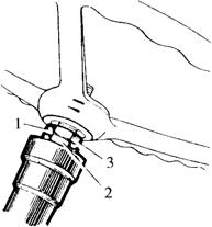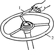 图4-52 测量转动方向盘所需的力 1弹簧拉力计 2.方向盘 (2)蜗杆与滚轮啮合间隙的调整:当滚轮处于中间位置(即拖拉机直线行驶位置)时,在转向盘左右各转90°的范围内,不应有啮合间隙,否则,应进行调整。调整方法如下: ①从拖拉机上卸下转向器。 ②拧下锁紧螺母,取下止动垫圈。 ③拧入调节螺钉,使滚轮在蜗杆中间位置时,蜗杆与滚轮的啮合间隙为0,此时转动转向盘的力应在9.8~24.5N范围内。 ④按上述拆卸的相反程序装复。 (3)转向纵拉杆和横拉杆球接头的调整,取出开口销4(图4-53),拧入螺塞3,直至用力才能推动球节销时为宜,然后装复。