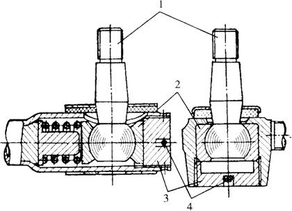 图4-53 转向纵拉杆和横拉杆球接头总成 1.球节销 2.球节销座 3.调节螺塞 4.开口销 2.螺杆螺母循环球式转向器转向盘自由转角的检查与调整(以上海-50型拖拉机为例) (1)转向盘自由转角的调整:转向盘自由转角一般调整为15°。在使用过程中,由于滚珠上下座、滚珠的磨损,引起滚珠和上下座之间间隙增大,因而转向盘自由转角就增大,此时就须进行调整。调整方法如图4-54,打开保险垫片1,松开螺母3,用扳手旋转转向滚珠上座2,待间隙消除后,再将螺母拧紧,将保险垫片锁好。