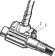 图4-54 方向盘自由行程调整 1.保险垫片 2.转向轴滚珠上座 3.螺母 (2)固定销与转向螺母间隙调整:固定销头部和转向螺母连接处在使用过程中由于磨损使间隙增大,转向盘会产生松动现象,此时必须调整该间隙。调整方法见图4-55,松开固定销两侧的固定螺栓1,抽出垫片2,调整到固定销和转向螺母的配合无间隙但又能用很小的力矩转动转向螺杆为宜。