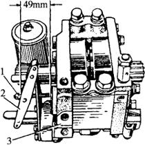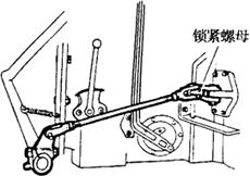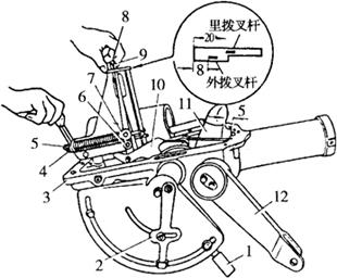 图4-61 内外拨叉杆偏心轮调整 1.里手柄 2.外手柄 3.液压升降机盖 4.外拨叉螺母 5.里拨叉螺母 6.螺母 7.偏心轮 8.里拨叉杆 9.外拨叉杆 10.外拨叉片 11.曲柄 12.升降臂 ①松开外拨叉杆9上偏心轮7的固定螺母6。 ②将升降臂12放在最高位置,使液压升降机盖3后端与曲柄11之间有5mm的间隙,同时将里手柄1推向“升”的位置。 ③拧动螺母4调整外拨叉杆9,使其下端边距支架槽前边为8mm,调好以后,将螺母4锁紧。 (2)偏心轮的调整:农具的快速下降或慢速下降,是通过调整偏心轮的位置来实现的。其调整步骤如下(图4-61): ①升降臂仍放在最高位置。 ②里手柄1推向“快”的位置,使外拨叉杆9的下端与支架槽的前边轻微接触。 ③拨动偏心轮7,使之与外拨叉片10的前端接触,然后拧紧螺母6。 ④慢速下降时,农具、里手柄、控制阀相对位置核对,升降臂仍放在最高位置,将里手柄放在“慢”的位置上,此时外拨叉杆下端前边与支架槽前边相距6mm。 (3)里拨叉杆的调整:运用液压输出时,外手柄2与控制阀的相对位置是通过里拨叉杆8的调整来实现的。里拨叉杆8的调整步骤如下(图4-61): ①将外手柄2推向扇形板上方。 ②用扳手拧动螺母4调整里拨叉杆8使其下端边距支架槽前边为20mm,调整好后,将螺母4锁紧。 (4)控制阀摆动杆的调整: ①在液压泵装入后桥壳之前,以旋动螺母1(图4-62)来调整摆动杆2的支点位置,使摆动杆的支点至液压泵后盖3的距离为49mm。