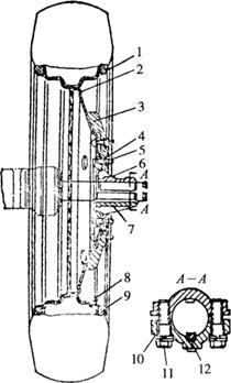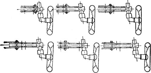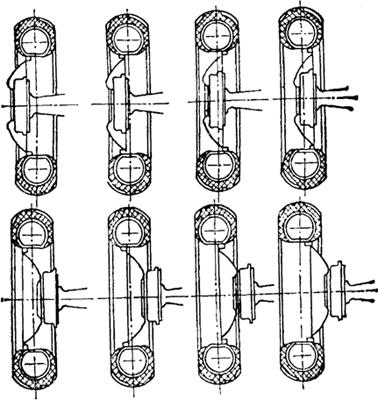 图4-58 前轮轮距调整法 后轮轮距的调整包括有级式和无级式两种:有级式调整是通过改变轮辐与轮圈的连接位置及翻转轮盘的方法来实现(图4-59)。如泰山-25、上海-50型等拖拉机是有级式调整。无级式调整是通过改变轮毂在驱动轴上的位置来实现(图4-60)。铁牛系列等属于无级式调整。