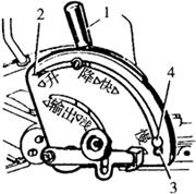 图4-63 液压操纵位调节手柄操纵 1.定位调节手柄 2.定位螺钉 3.定位螺钉 4.定位手轮 (6)扇形板上定位手轮的调整:扇形板上有两只定位手轮,各定位手轮调整方法如下: ①农具入土速度选定后,将里手柄1停在与速度相对应的位置上,然后移动定位手轮4与里手柄1相靠并拧紧固定(图4-63)。 ②使用力调节耕作时,耕深选定后,将外手柄1(图4-64)停在与耕深相对应的位置,将定位手轮2移至外手柄1槽的中央并拧紧固定。