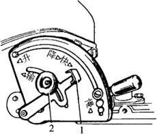 图4-62 液压泵控制阀摆动杆的调整 1.螺母 2.摆动杆 3.后盖 ②将液压升降机盖总成和液压泵装入后桥壳后,应通过后桥壳右侧窗孔检查里外拨叉杆与摆动杆的相对位置是否正确,检查前先将里手柄放在“快”的位置上,外手柄放在“深”的位置上,以使里外拨叉杆下端与支架槽的前边接触,这时里外拨叉杆的最下端部分和摆动杆上端的滚轮保持轻微的接触,若不对,应重新调节摆动杆支点位置。 (5)扇形板上,上止点螺栓位置的调整(图4-63):将里手柄1向“升”的方向移动,农具上升到所需要的高度时(注意悬挂臂限动链不得处于紧张状态,否则会引起机件损坏)停住里手柄,将上止点螺栓2移至与里手柄相接触后拧紧固定。再将里手柄向“慢”的方向移动,直到农具下降后将要回升而未回升时,停住里手柄,将下止点螺栓3移至与里手柄相接触后拧紧固定。