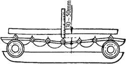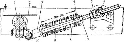 图4-64 液压操纵力调节手柄操纵 1.力调节手柄 2.定位手轮 (八)履带紧度的检查与调整 履带式拖拉机(东方红-75、802型拖拉机)履带过松,行驶中容易产生履带振跳和滑脱,过紧则增大动力消耗并加速有关机件的磨损,故应及时检查和调整履带的紧度即下垂度。检查调整时将拖拉机停放在平坦的硬地上,取一平直木条置于两托轮上方的履带爪上,测量下垂量最大处的履带爪上端至木条下平面间的距离。如图4-65所示。履带正常的下垂度为30~50mm,这时张紧弹簧的压缩长度是260~265mm(图4-66)。下垂度过大时,可转动张紧螺杆后端的调整螺母,以使导向轮前移而张紧履带。若张紧螺杆已拧到底,而履带下垂度仍然过大时,则应取下一节履带板。