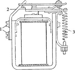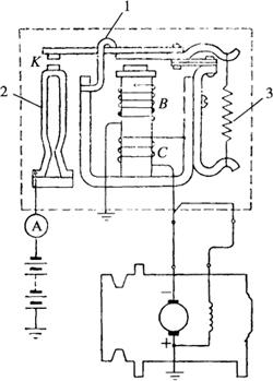 图4-67 发电机和调节器试验线路图 把开关转到A处,接通蓄电池,闭合电闸使试验台的电动机拖动发电机缓慢运转,逐渐提高发电机转速,注意观察电压表指针的指示数值。开始时发电机的电压随转速的增加而逐渐增加,当电压突然下降时,可听到逆流切断器触点闭合的搭声。在将要下降时电压的最大值即为逆流切断器的闭合电压,此值应与规定值相符(表4-4)。否则可调整逆流切断器弹簧3的拉力或动铁上边的限位钩1(图4-68),改变触点打开状态时动铁与铁心的间隙A,使之达到规定值。