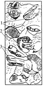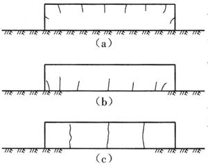 图11-14 微观裂缝示意图 1-粘着裂缝;2-水泥石裂缝;3-集料裂缝 1)粘着裂缝,即沿着集料周围出现的集料与水泥石粘结面上的裂缝。 2)水泥石裂缝,即分布于集料之间的水泥浆中水泥石裂缝。 3)集料裂缝,即存在于集料本身的裂缝。 以上三种微观裂缝,以粘着裂缝和水泥石裂缝较多,而集料裂缝较少。 微观裂缝在混凝土中的分布是不规则的,沿截面是不贯穿的。因此,有微观裂缝的混凝土可以承受拉力,但结构物的某些受拉较大的薄弱环节,微观裂缝在拉力作用下,很容易串联贯穿全截面,最终导致较早的断裂。 (2)宏观裂缝 混凝土中宽度不小于0.05mm的裂缝是肉眼可见裂缝,亦称为宏观裂缝。宏观裂缝是微观裂缝不断扩展的结果。 在混凝土工程结构中,由于微观裂缝对防水、防腐、承重等都不会引起危害,所以具有微观裂缝结构则可假定为无裂缝结构。在结构设计中所谓不允许出现裂缝,也是指宽度不大于0.05mm的初始裂缝。由此可见,有裂缝的混凝土是绝对的,无裂缝的混凝土是相对的。 产生宏观裂缝一般有外荷载、次应力和变形变化三种起因,前两者引起裂缝的可能性较小,后者是导致混凝土产生宏观裂缝的主要原因。宏观裂缝又可分为表面裂缝、深层雷锋和贯穿裂缝三种,如图11-15所示。