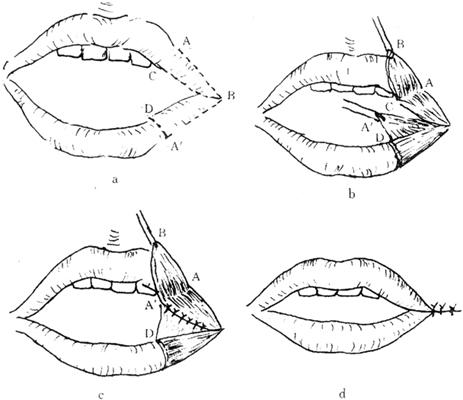 图15-7 大口畸形直接缝合法 a.切口及定点 b.掀起三角瓣 c.下唇红黏膜瓣内翻 d.缝合后 (3)沿唇红上ABC线和BA'D线分别切开唇红,将两个三角形唇黏膜瓣掀起。 (4)下唇红黏膜瓣内翻,A'B与BC缝合作口腔衬里,缝合肌肉。 (5)修整上唇黏膜瓣后与BA'D唇红创缘缝合,构成患侧口角,皮肤对应缝合。 2.“Z”成形术 (1)新口角位置定位同前,在新口角处的上、下唇缘处各定一点(图15-8)。