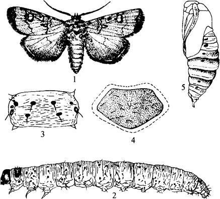 | 释义 | 大地老虎 【学名】 Agrotis tokionis Butler。 【分布与为害】 在长江流域发生较多,北方较少。食性很杂,许多花木幼苗均可受其害。 【形态特征】 成虫体长20~25毫米,翅展40~52毫米。头、胸部褐色,腹部灰黑色。雌蛾触角丝状,雄蛾触角栉齿状。栉齿分枝较长,向端部逐渐短小。颈板中部有1条黑横线。前翅灰褐色,前缘自基部至2/3处黑褐色。肾状纹及环纹明显,其周围有黑褐边。肾状纹外侧有1不规则黑纹。亚基线、内、外横线均为双条曲线。有时,中横线、亚外缘线极不明显(图6-37)。卵为半球形,直径1.8毫米,浅黄色,变褐、灰褐色。老熟幼虫体长40~60毫米,黄褐色,体表多皱纹,颗粒微小。腹部第一至三节背面中部有4个毛片,前2个稍小。臀板密布龟裂状皱纹,除末端2根刚毛附近,几乎全部为深褐色。腹足趾钩5~14个。蛹长23~29毫米,赤褐色。腹部第一至四节侧面有明显横沟,第三至五节比中胸及腹部第一、二节为粗。第四至七腹节基部密布刻点。第五至七腹节刻点环绕一周。腹末臀棘呈三角形,具短刺1对。