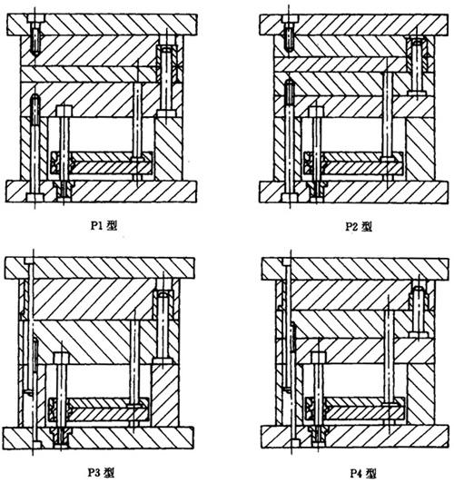 | 释义 | 大型模架 3.2.2.1 大型模架的结构形式 塑料注射模大型模架的结构形式有: ①按结构特征分为基本型和派生型。基本型模架有A和B两种,见图3-28;派生型模架有P1、P2、P3和P4四种,见图3-29。