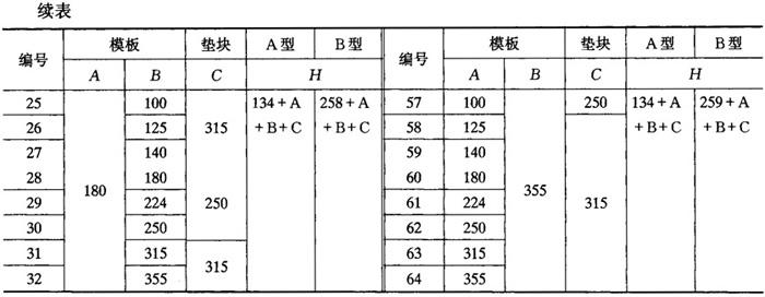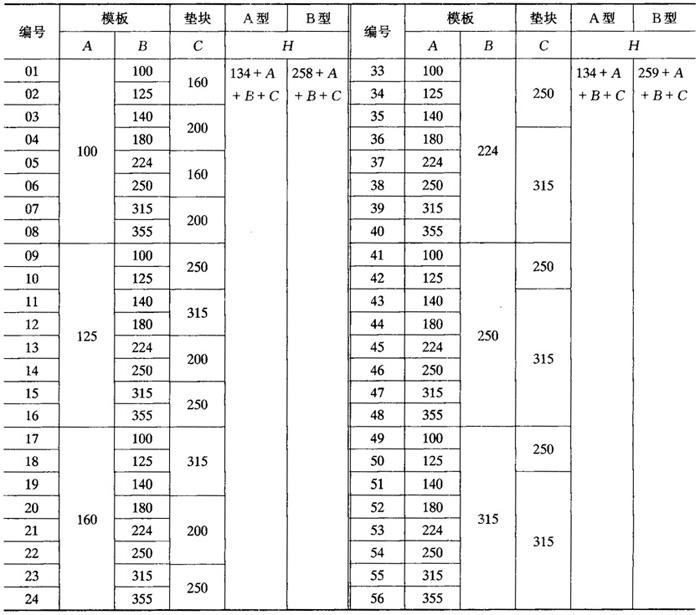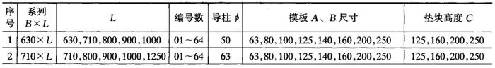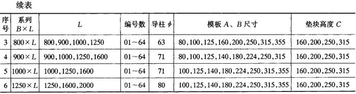 图3-29 派生型模架P1~P4 A型:由定模两模板,动模一模板组成; B型:由定模二模板,动模二模板组成; P1型:定模二模板,动模二模板的脱件板结构; P2型:定模二模板,动模三模板的脱件板结构; P3型:定模二模板,动模一模板的点浇口结构; P4型:定模二模板,动模二模板的点浇口结构。 ②定模座板、动模座板可以做成带肩型,也可以做成无肩型(压板槽尺寸及位置由承制单位决定)。 ③模架的导向零件、导柱可以采用带头导柱或有肩导柱,导套采用直导套。 3.2.2.2 大型模架的尺寸组合 大型模架的尺寸组合原则和中小型模架相同,表3-23是《塑料注射模大型模架》(GB/T12555—90)的全部尺寸组合系列,表3-24为1000×L系列模架的标准,表3-25为1000×L模架规格。 表3-23 塑料注射模大型模架(GB/T12555—90)(mm)