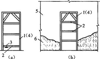 图9-23 预制承重外墙板和非承重内纵墙板及内墙采用现浇的施工程序 2.施工工艺 (1)抄平放线 抄平放线工作是确保墙体位置正确、进行安装模板的标准,主要包括轴线、墙身线、模板就位线,门口、隔墙、阳台位置及抄水平线等。 大模板在安装之前,应将轴线从标准轴线桩引至外墙上口,再引至楼板面作为楼面轴线的依据;根据轴线放出内外墙的轴线,弹出墙身线、模板的就位线,作为安装大模板的依据,同时弹出门窗洞口、隔墙、阳台等的安装线。 每幢建筑物在适当位置应设置1~2个标准水平桩,作为施工标高控制的依据。在安装大模板前,将水平标高引测到建筑物的第一层墙上,作为控制水平线,各楼层的标高均应以此线为基线,用仪器或钢尺引测上去,每个楼层设两条水平线,一条离地面50cm,供装修工程使用;另一条距楼板下皮10cm,用以控制墙体顶部的找平层和楼板安装标高。另外,有时需要在墙体钢筋上也弹上水平线,用以控制大模板安装的水平度。 (2)绑扎钢筋 大模板施工的墙体宜用点焊钢筋网片,网片间的搭接长度和搭接部位均应符合设计中的规定。点焊好的钢筋网片在堆放、运输和吊装过程中,应采取措施防止钢筋产生弯折变形和点焊脱落。上下层墙体钢筋的搭接部分应当顺直,并绑扎牢固。双排钢筋网片之间应设置绑扎定位连接钢筋;钢筋与模板之间应绑扎砂浆垫块,其间距不宜大于1m,以确保钢筋位置准确和墙体保护层厚度。 在外墙模板安装前,应将两侧伸出的钢筋套环理直。在外墙模板就位后,两块外墙模板的套环和内墙的钢筋套环应重合,将本层的竖向钢筋插入内外墙重合的套环内,对每块外墙板和内墙,插入的套环不得少于3个,并确实绑扎牢固。 (3)大模板的处理与安装 大模板进至安装现场后,首先应做好模板安装前的一切准备工作。认真核对模板型号、清点数量,在模板背面进行编号;在模板就位前,应认真涂刷脱模剂,将安装位置的楼面清扫干净,检查墙体中心线和模板就位线,待一切准确无误后方可进行安装。 在安装模板时,应按照预先编排的顺序吊装,按墙身线就位,并通过调整地脚螺栓,用靠尺等方法反复检查校正模板的垂直度。在内外侧模板合模前,还应检查墙体钢筋、水暖电器管线、预埋件、门窗洞口模板和穿墙螺栓套管等,是否还有遗漏、位置是否正确、安装是否牢固、是否影响墙体强度等,并彻底清除模板内的杂物。 模板经过校正合格后,在模板顶部安放上口卡子,并紧固穿墙螺栓或销子。在紧固时要注意紧固适度,不可过松或过紧。为防止墙体出现漏浆烂根现象,在模板就位固定后,其周边的缝隙要用小角钢、窄钢片、木条等材料堵严。为防止模板下部漏浆,还可以采用预先在安装模板位置抹水泥砂浆找平层,待砂浆凝固后再安装模板。 门口模板的安装方法有两种:一种是先立门洞,后安装门框;另一种是直接立门框。 在采用先立门洞的方法时,如果门洞的设计位置固定,则可在模板上打眼,用螺栓固定门洞模板比较简便;如果门洞设计位置不固定,则可在钢筋网片绑扎完毕后,按设计位置将门洞模板钉上钉子,与钢筋网片焊在一起固定。模板框中部均需要加设三道支撑(图9-24),前后两面(或一面)各钉一木框(用5cm×5cm方木),使模板框侧边与墙的厚度相同。在拆除模板时,拆掉方木和木框。这种方法的模板框比较牢固,但在浇筑混凝土时,要注意两侧的混凝土浇筑高度大致相等,不得超过50cm,振捣时要注意附近挤动模框。先立门洞的缺点是拆模比较困难,门洞周围后抹的灰砂易出现开裂和空鼓。