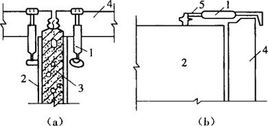 图9-24 门口先立门洞示意图 1-门框;2-方木;3-螺栓;4-木框;5-大模板;6-混凝土 采用直接立门框的方法时,用木材或小角钢制成带有1~2mm坡度的工具式门框套模,夹住门框的两侧,使其总厚度比墙宽度大3~5mm。门框口内设计临时的或工具式支撑加固。在立好门洞口后,两边由大模板夹紧。在模板上对应门框的位置预留好孔眼,用钉子穿过孔时,将门框套模紧固于模板上。为防止门框产生移动,还可以在门框两侧钉上若干钉子,将钉子与墙体中的钢筋焊接。这种方法既省工又牢固,但要注意施工中的定位若不牢,易造成门口歪斜和移动。 另外,采用先立门洞工艺,宜多准备一个流水段的门洞模板,采取隔天拆模,以保证洞口的棱角整齐。 模板安装完毕后,应将每道墙的模板上口进行找直,并检查扣件、螺栓是否紧固,拼缝是否严密,墙厚是否准确,与外墙板拉结是否牢固。检查验收合格后,方可浇筑混凝土。 在常温条件下,墙体混凝土强度必须超过1N/mm2才能拆模。跨度大于1m的门洞口的拆模强度,不能与墙体一样,必须与设计单位共同商定,以防止门洞口产生裂缝。 在拆除模板起吊之前,应认真检查穿墙螺栓是否全部抽出,模板之间的连接件是否全部脱开。开始起吊时应采用试探性的方式轻轻提升,在吊离墙体时应垂直慢速提升,待完全无障碍后才可吊走。 (4)墙体混凝土的浇筑 为了便于墙体混凝土振捣密实,确保墙面达到平整光滑,混凝土的坍落度一般采用7~8cm,并用软轴插入式振捣棒分层进行振捣,每层的间隔时间不应超过2h,或根据水泥的初凝时间确定。为使新浇筑的混凝土与下层混凝土结合良好,在浇筑上层混凝土前,宜浇筑一层厚度为50~100mm、与原混凝土内砂浆配合比相同的水泥砂浆。 混凝土的下料点应根据实际分散布置。浇筑门窗洞口位置的混凝土时,应注意从门窗口正上方下料,这样能使其两侧同时均匀浇筑,避免发生偏移。墙体的施工缝一般宜设在门窗洞口上,连续梁跨中1/3区段。当采用组合平模方案时,可留在内纵墙和内横墙的交接处,对于接槎处的混凝土应加强振捣,保证接槎严密。 在墙体混凝土浇筑完毕后,应立即按照抄平标高进行找平,以确保安装楼板的底面平整。 (5)模板拆除与养护 在常温情况下,墙体混凝土强度超过1N/mm2时便可拆除模板。拆除模板的顺序是:首先拆除全部穿墙螺栓、拉杆及花篮卡具,再拆除补缝钢管或木方,卸掉埋设件的定位螺栓和其他附件,然后将每块模板的地脚螺栓稍稍升起,使模板在脱离墙面之前有少许的平行下滑量,随后再升起后面的两个地脚螺栓,使模板自动倾斜脱离墙面,并用起重机将模板吊起。在任何情况下,不得在墙上口晃动、撬动或敲砸模板。模板拆除后,应及时清理干净。 在拆除模板后,混凝土暴露于空气之中,很容易引起干缩而裂缝,此时必须立即对混凝土墙体进行淋水养护,一般养护时间不得少于3d,淋水的次数应根据气温、湿度、风力等确定,以能保证混凝土湿润状态为宜。有时为了加速模板的周转和提高生产效率,在配制混凝土时可掺加适量的早强剂。 (6)预制构配件的安装 承重外墙板的安装,应在内墙模板安装就位、准确稳固后进行。外墙板与内墙模板及大角处相邻的两块外墙板应相互拉结固定,其拉结固定的连接方式如图9-25所示。