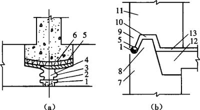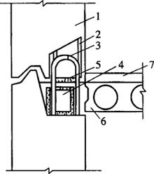 图9-26 上下层外墙连接节点 1-预制外墙板;2-墙板下部顶面键槽及甩出的钢筋;3-墙板上部吊环及甩出的钢筋焊接;4-钢筋混凝土圈梁;5-水泥砂浆;6-空心楼板;7-楼地面 在安装楼板时,墙体混凝土强度必须达到4N/mm2以上。如果需要提前安装,应采取硬架支模等相应的技术措施。在安装前,应将墙顶上的杂物清理干净,楼板应顺好板端的锚固筋,按照设计要求将其弯起。楼板应当边坐浆边安装,楼板两端在墙上的搁置长度应满足设计要求。板端缝隙的处理应单独作为一道工序,用不低于C20的细混凝土灌实。 楼板安装完毕后,要及时安装楼梯、阳台、通风道等构件,并进行板缝的堵塞施工。 (7)外墙防水保温施工 外墙板防水保温工程施工要求非常严格,技术上有一定的专业性,应组成专业班组进行施工。外墙板的防水构造必须完整,尺寸和形状必须符合设计要求。如果有损伤,应在安装前加以修补;严重损坏者,不得作为构造防水墙板使用。 外墙板的立槽、腔壁应涂刷一道防水涂料。为确保防水效果,墙体防水构造比较复杂,主要由防水砂浆、防水塑料条、防水涂料、油毡、聚苯乙烯泡沫塑料、挡水台阶、披水等组成,如图9-27所示。