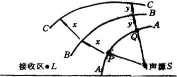 图11.2-1 大气中的声波(a)无风时,(b)有风时 (2)因温度引起: 由于上述声速对温度的依赖关系。暖和空气中的声波传播,要快于较冷的空气。这种不均匀性也会引起大气中声波的折射。夏天的下午,地面的空气要比上空高,因而往往会出现比较宁静的环境。在图11.2-2中令AA代表某一时刻由声源S发出的声波的波阵面,过一定的时刻以后近地面的P点所传播的距离x,要大于上空的Q点所传播的距离y,在AA上的其它点上所传播的距离连续地界乎这两者之间,若以P、Q及它们中间的其它点为中心,以x及y和它们中间其它距离为半径作圆弧,然后画出这些圆弧的包络面即为这一时刻声源S的波阵面,图中以B曲线代表。可以看出它已经向右倾斜,故其方向已发生变化,它不再平行地面传播。再过一时刻,同样可得出波阵面C。它倾斜的更多,因此,这种情况下声音就向上传播至高空中。在L位置(也可以在声源边侧)的听者就不大听得到了。如果这作为正的温度梯度的话,那么对于负的温度梯度,即近地面的空气比较凉时,情况就恰恰相反。它对应于夏天傍晚时的情形,这时波阵面的倾斜是使声音朝向地面传播。因此我们会感受到地面的听音条件夏日傍晚要比正午时良好一些。图11.2-3是表示这两种情况下的声音折射的简图。必须指出,实际上大气的折射要比刚才介绍的要复杂得多。因为不同的折射媒质之间的分界线并不是直线。此外,风速和温度变化的影响往往会同时存在。增加传播现象的复杂性。