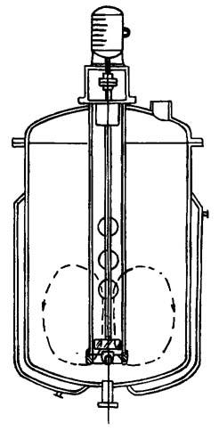 当然,单批分散配料方式在小规模生产中还是适用的。混和器可有各种型式。为了提高搅拌效率,选用涡轮式搅拌装置,此种混和器示意图见图3-1-3。这种机械搅拌形式的径向液流速度大,混和效率高。在混和器内设置一根具有一组排料孔的直管,物料在叶轮的抽提作用下从管内沿轴向上升,经排料孔急速排出,以增加物料的碰撞和旋涡运动,使物料迅速混和均匀。大混和的操作条件参见表3-1-8。