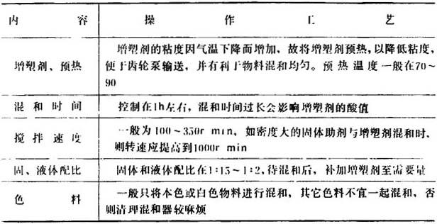 这里所指的大混和是根据单批生产的产品配方所用的各种增塑剂、稳定剂等助剂的用量,放大几十倍,在混和器中物料在受热膨润的条件下,用强烈的机械搅拌,使之微细化,并充分混和均匀后,泵送到贮槽,供混炼之用。这种方法适用于现代化工业生产,它比单批分散配料操作具有下列优点:
