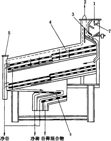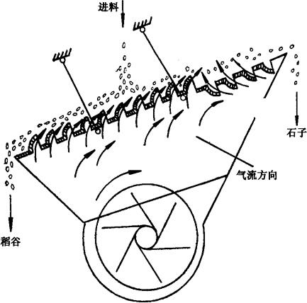 图1-2-3 高速筛工作原理图 1-进料口 2-轻杂出口 3-前风道 4-主筛 5-后风道 6-副筛 7-淌板 高速筛的筛体由主筛和副筛两部分组成。主筛包括上、下两部分,共4层并联筛面;副筛较小,分两层。作业时,含稗稻谷由进料口1喂入,经过分料机构进入第一层和第三层筛面。振动传动机构使筛体产生振动,物料过筛。4层筛的筛上物合并为净谷。第2层和第4层筛下物合并流入第1层副筛,第1层副筛筛下物得净稗,筛上物继续通过第2层副筛。第2层副筛筛下物则为谷稗混合物,回主筛进口处理,筛上物则作为净谷。 3.1.3 相对密度去石机(图1-2-4) 相对密度去石机是一种利用稻谷和杂质相对密度和悬浮速度的不同,借助气流的作用进行分选的去石设备,主要用于分离稻谷中分离筛选设备难以处理的并肩石和并肩泥块。