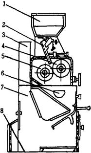 图1-2-5 胶辊砻谷机 1-进料斗 2-喂料淌板 3-谷壳排出口 4-慢辊 5-快辊 6-缓冲槽 7-谷壳分离装置 8-谷糙混合物出口 胶辊砻谷机是借助于一对相向转动,但有一定速度差的胶辊,在胶辊的压力下,对稻谷进行挤压和搓撕达到脱壳的目的,工作时稻谷由进料斗1通过喂料淌板2进入两橡胶辊筒之间进行脱壳,脱壳后的混合物在砻谷机底座的谷壳分离装置7中分离出谷壳,谷壳由吸风管排出。 3.2.2 砂盘砻谷机(图1-2-6) 砂盘砻谷机俗称砂砻。它具有结构简单、取材方便、造价低廉、砂盘能自行烧制等特点。