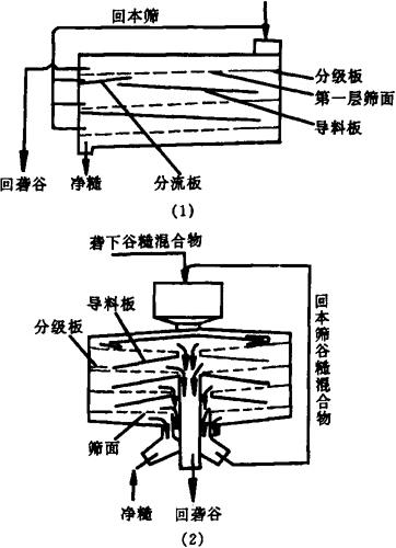 图1-2-6 砂盘砻谷机 1-进料斗 2-砂盘 3-连接斗 4-传动机构 5-谷壳分离装置 6-机架 7-谷糙混合物出口 8-谷壳排出口 砂砻主要由进料斗、砂盘、轧距调节机构、传动机构和谷壳分离装置等部分组成。主要工作机构是上、下两个平卧的砂盘。工作时,上盘固定不动,下盘作平面旋转运动。当谷粒由上砂盘中心进料斗1落入转动的下砂盘2时,在惯性离心力的作用下,便迅速进入金刚砂盘工作区(轧距)内。由于谷粒本身惯性离心力和下砂盘摩擦力的作用,使谷粒受到摩擦、挤压、剪切、搓撕等综合作用力,使谷壳破裂、脱离。脱壳后的混合物经连接斗3流入底部的谷壳分离装置5,分离出谷壳,并从垂直风道谷壳排出口8吸走。谷糙混合物由出料口排出机外。 与胶砻比较,其作用力强,对谷粒损伤较大,在许多地方逐渐被胶砻取代。 砂盘工作表面性状对稻谷的脱壳率及碎米率有很大影响,所以一般采用不同粒度的金刚砂按一定比例混合。 3.3 谷糙分离装备 3.3.1 选糙溜筛(图1-2-7) 选糙溜筛具有结构简单、造价低、制作方便、不需动力等优点。但由于所需设备多、筛面多、筛理路线长、筛理效率低、占用厂房面积大、回流量大等缺点,不适用于原粮品种多变和采用气力输送的米厂。图1-2-7所示为6层筛面组成的多层谷糙分离溜筛的工艺流程图。筛体上装有双向螺杆式的筛面调节机构,用以调节筛面倾角。