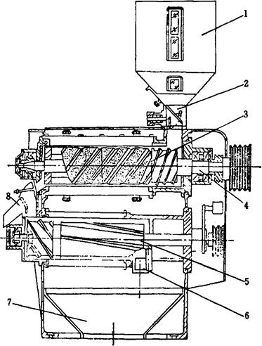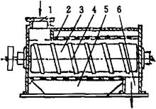 图1-2-12 喷风碾米机结构 1-进料斗 2-碾白室 3-喷风风机 4-吸糠风机 5-压紧轮 6-喷风风管 工作时,糙米从进料斗1经流量控制机构由螺旋推进器送入碾白室2。先利用砂辊进行碾削碾白,再用铁辊筒进行擦离碾白。在碾米过程中,由喷风风机3通过喷风风管6向碾白室内喷进适量的空气。碾米时产生的糠粞混合物由吸糠风机4吹至集糠器,故工作时无米糠外扬。碾白后由出口排出的白米在出口处经吸糠后即为成品大米。 采用喷风碾米,能使米粒在碾白过程中所产生的热量及水分及时散发出去,使米温低,色泽好,增加了米粒强度,减少了碎米。同时帮助米粒翻滚,促进米糠及时排出,提高效能。 3.5 成品及副产品整理设备 3.5.1 擦米机 擦米机的主要作用是擦除粘附在米粒表面的糠粉,使白米表面光洁,提高成品的外观色泽,并利于大米的贮藏和米糠的回收,常见有立式擦米机和卧式擦米机。 图1-2-13所示为卧式擦米机。其主要工作部件为-旋转的擦辊,上面装有螺旋形的橡胶带。白米从进料口1进入工作区,依靠擦辊3的转动使米粒在工作区内反复受到擦刷和翻动,将糠粉刷去,糠粉通过筛筒2从糖粞出口5排出。而米粒在倾斜橡胶带4的推送下,从出米口6排出。卧式擦米机具有比立式擦米机擦米路线长、作用缓和、擦米效率高、产生碎米少等特点。