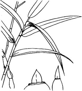 图2-193 大肚竹 (1)植物学特征。大肚竹,禾本科,刺竹属。秆矮小,幼秆绿色,稍有白粉,老时变橙黄色。正常秆,节间较长,圆柱形,基部不膨大,畸形秆多是一面强曲,节间短,基部膨大如瓶状,中间型秆,稍有弯曲,节间短,呈棒状,枝疏散,小枝具有5~12片叶子,初为绿色,后变黄色。 (2)对环境与土壤的要求。大肚竹喜温暖、阳光。好生于湿润、排水良好的沙壤土。 (3)施肥技术。①移栽时,应施足以有机肥为主的基肥,保持土壤湿润。②冬季可用马粪、糠土、河泥壅土6~10厘米,即可防寒,又可施肥。③追肥宜少,只追施薄肥。生长后期应追施适量的磷、钾结合的肥料。④发现竹子开花现象,应立即砍伐,伐后要及时施入适量氮肥。 |