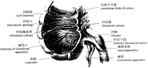 图9-25 结肠 (一)盲肠与阑尾 1.盲肠(cecum) 位于右髂窝内,长约6~8cm,是大肠的起始部,下端呈盲囊状,借回盲口(ileocecal orifice)接回肠,该口的边缘有上、下两片唇状黏膜皱襞,称为回盲瓣(ileocecal valve),此瓣可控制回肠排放内容物的速度,使食物在小肠内充分消化吸收,还可防止大肠的内容物逆流(图9-26)。在该瓣下方约2.0cm处盲肠后内侧壁处有阑尾口(orifice of vermiform appendix)。