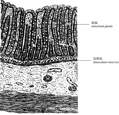 图9-28 妊娠期阑尾位置示意图 (二)结肠 结肠(colon)围绕在小肠周围,在右髂窝内续于盲肠,相当于第3骶椎平面连于直肠。可分为升结肠(ascending colon)、横结肠(transverse colon)、降结肠(descending colon)和乙状结肠(sigmoid colon)四部。 结肠黏膜表面既没有环形皱襞,也没有绒毛,吸收细胞主要吸收水分和电解质。含许多直管状腺体,杯状细胞特别多(图9-29),可分泌大量黏液,润滑大肠,有助于排除粪便,亦可保护肠壁免受细菌侵蚀。肌层的外纵行肌加厚形成三条等距排列的纵向带,称结肠带(teniae coli)。收缩时,有助于肠管更进一步缩短以推动大肠内容物。由于结肠内容物移动较缓慢,加之结肠内有合适的温度和pH,细菌在结肠内可大量繁殖,细菌占粪便中固体总量的25%左右,主要为厌氧菌(anaerobic bacteria),具有消化及营养作用,可使植物纤维和糖类、脂肪分解等。