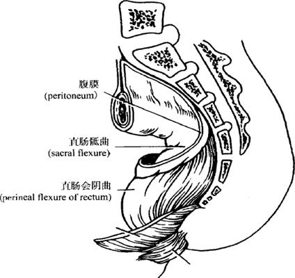 图9-29 结肠组织结构 (三)直肠 直肠(rectum)位于小骨盆腔的后部、骶骨的前方,在第3骶椎前方续与乙状结肠,沿骶骨前面下行穿过盆膈(pelvic diaphragm),移行于肛管。 直肠不是直的,在矢状面上有两个弯曲,即骶曲(sacral flexure)和会阴曲(perineal flexure)(图9-30)。前者在骶、尾骨前面下降,凸向后方;后者绕过尾骨尖(apex of coccyx),凸向前方。临床上进行直肠镜等检查时,必须注意这两个弯曲,以免损伤肠壁。直肠下段肠腔膨大,称直肠壶腹(ampulla of rectum)。直肠腔内常有2~3个半月形皱襞,称直肠横襞(transverse folds of rectum),其中最大而且固定的一个横襞在壶腹上份,位于前壁,距肛门约7.0cm,可作为直肠镜检查的定位标志。男女直肠的毗邻不同,男性直肠的前方有膀胱(urinary bladder)、前列腺(prostate)、精囊腺(seminal vesicle);女性直肠的前方有子宫(uterus)及阴道(vagina)。直肠指诊可触到这些器官。