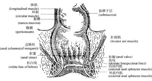 图9-30 男性盆腔矢状切(示直肠弯曲) (四)肛管 肛管(anal canal)是盆膈(pelvic diaphragm)以下的消化管,上续直肠,下接肛门,长约4.5cm,为肛门括约肌(sphincter ani)所包绕,平时处于收缩状态,其生理功能是控制粪便的排泄(图9-31)。肛管内面有6~11条纵行皱襞称肛柱(anal columns)。相邻各柱下端之间有半月状皱襞相连,称肛瓣(anal valves)。肛瓣与相邻两个肛柱下份之间形成的小隐窝,称肛窦(anal sinuses),窦内易积存粪便,如发生感染可引起肛窦炎,甚至可发展为直肠肛管周围脓肿或肛瘘等。肛柱上端的连线称肛直肠线(anorectal line),是直肠与肛管的分界线。肛瓣或肛柱的下端共同形成锯齿状环形线,称齿状线(dentate line)或肛皮线,此线以上为黏膜,其上皮为单层柱状上皮;以下为皮肤,其上皮为复层扁平上皮。在齿状线下方,肛管内面由于肛门括约肌收缩,而形成一光滑微隆起的环形带,称为肛梳(anal pectin)或痔环。肛梳下缘有一条环形的白线(white line),此线恰好位于肛门内外括约肌之间,故在肛门指诊时可触知此处有一环形浅沟。在肛管的黏膜下和皮下有丰富的静脉丛,病理情况下曲张而突起称为痔(hemorrhoid)。发生在齿状线以上的称为内痔(internal hemorrhoid),齿状线以下的称为外痔(external hemorrhoid)。肛管周围有肛门内、外括约肌环绕。肛门内括约肌(sphincter ani internus)属平滑肌,是直肠壁环行肌增厚而成,有协助排便的作用。肛门外括约肌(sphincter ani externus)为横纹肌,围绕在肛门外括约肌的周围,可随意括约肛门,控制排便。手术时应防止损伤,以免造成大便失禁。