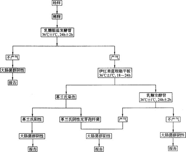 | 释义 | 大肠菌群的测定 大肠菌群系指一群能发酵乳糖,产酸产气,需氧和兼性厌氧的革兰氏阴性无芽孢杆菌。该菌主要来源于人畜粪便,故以此作为粪便污染指标来评价食品的卫生质量,推断食品有否污染肠道致病菌的可能。 食品中大肠菌群数系以100mL(g)检样内大肠菌群最可能数(MPN)表示。 1.培养基和试剂 (1)乳糖胆盐发酵管 按本节九 (三)4规定。 (2)伊红美蓝琼脂平板 按本节九 (三)10规定。 (3)乳糖发酵管 按本节九 (三)5规定。 (4)EC肉汤 按本节九 (三)6规定。 (5)磷酸盐缓冲液 按本节九 (二)8规定。 (6)生理盐水。 (7)革兰氏染色液 按本节九 (一)1规定。 2.检验程序 大肠菌群检验程序见图4-2-9。