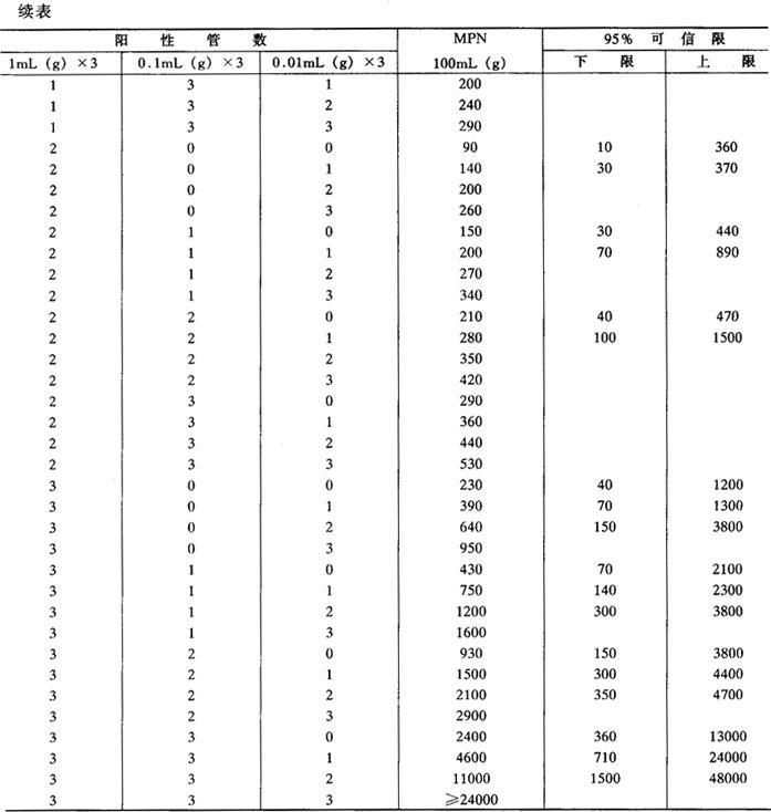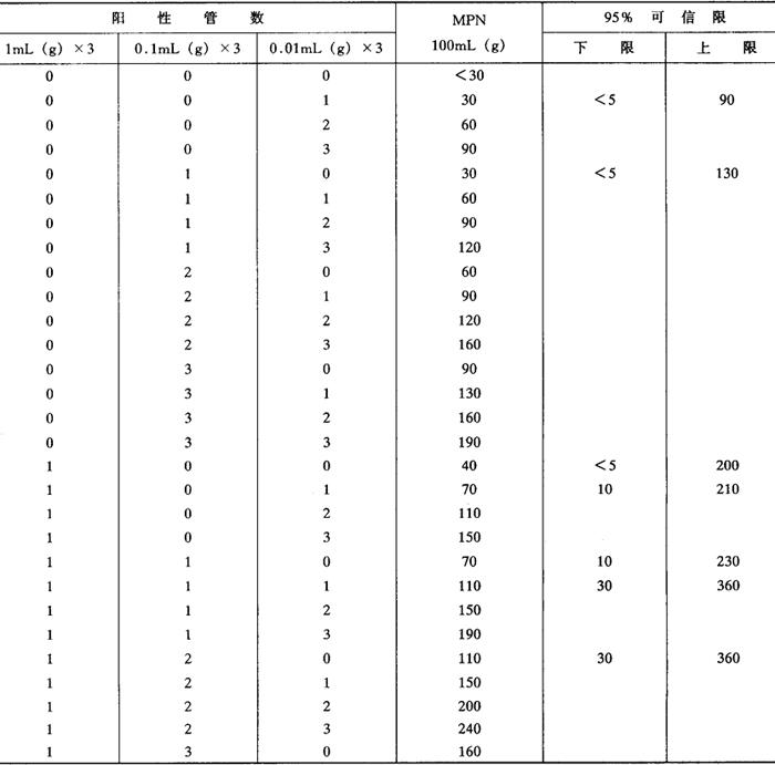 注:(1)本表采用3个稀释度〔1mL(g)、0.1mL(g)和0.01mL(g)〕,每稀释度3个管。 (2)表内所列检样量如改用10mL(g)、1mL(g)和0.1mL(g)时,表内数字应相应降低10倍;如改用0.1mL(g)、0.01mL(g)和0.001mL(g)时,则表内数字应相应增加10倍,其余可类推。 |