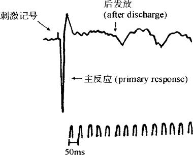 图12-115 正常人脑电波 (1)α波(alpha waves):频率为每秒8~13次,波幅为20~100μV,波形近似正弦波。α波在枕部和顶部最为显着。正常人在安静、清醒、闭目时出现α波,波幅由小变大,再由大变小呈梭状并反复出现。每一梭形波持续1~2秒。当受试者睁眼或思考问题时,α波即消失而转为β波,此现象称为α阻断(α-b1ock)。如果受试者又回到安静闭目状态,α波又可重现。 (2)β波(beta wave):指频率为每秒14~30次,波幅为5~20μV的快波。受试者睁眼视物,进行思考活动时出现。通常在额叶和顶叶记录时这种快波较为明显。因此,β波为大脑皮质处于紧张激动状态时电活动的主要表现。 (3)θ波(theta wave):指频率为每秒4~7次,波幅为100~150μV的慢波。儿童时期此波在枕叶和顶叶比较明显,成年人有时在困倦时或入睡后可记录到该波。 (4)δ波(delta wave):频率最慢,每秒只有0.5~3次,波幅为20~200μV。这种波在6个月以内的婴儿脑电图中常见,并占优势。成年人在极度疲劳、熟睡等情况下,也可出现δ波。在清醒状态下,正常成年人几乎不出现δ波。在丘脑非特异性投射系统(nonspecific projection system)功能不全时,或该系统受某种药物影响时,亦可引起δ波。表明δ波与丘脑非特异性传入功能有关。一般认为,高幅度的δ波与θ波的出现,表示大脑皮质处于抑制状态。 关于脑电图形成的机制,目前较多的观点认为主要与大脑皮质神经元的突触后电位(postsynaptic potential)的总和有关。许多神经元的突触后电位总和起来,即可引起皮质表面的电位变化。当大脑皮质众多神经元的电位变化在频率上与位相趋于一致时,也即同步化(synchronization)时,脑电波即出现高振幅、低频率的慢波;当大脑皮质众多神经元的电位变化不一致,即去同步化(desynchronization)时,脑电图则表现出低振幅、高频率的快波。 (二)大脑皮质诱发电位 在头皮表面也可记录到大脑皮质诱发电位(evoked potential),通常记录的诱发电位夹杂在自发脑电波之中,很难给予分辨,因此采用电子计算机使自发电位相互抵消,而诱发电位经过多次叠加后即可显示出来。以这种方法记录到的诱发电位称为平均诱发电位(average evoked potential)。 皮质诱发电位有两个成分,分别称为主反应(primary response)和后发放(after discharge)。前者为先正后负的电位变化,波幅较大,潜伏期一般为5~12ms。主反应为大锥体细胞的综合电位。后发放在主反应之后,是一系列波幅较小的正电位,频率为每秒8~12次(图12-116),它是皮层与丘脑接替核之间环路电活动的表现。平均诱发电位的研究目前已成为研究人类的感觉功能、神经系统的疾病以及行为与心理活动的一种方法。