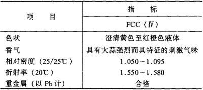 性状 澄清黄色至红橙色液体,具有大蒜强烈而具特征的刺激气味。溶于大多数固定油和矿物油,不完全溶于乙醇,不溶于甘油和丙二醇。