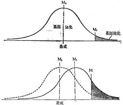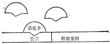 图19-1 正控制下的基因概略 为了结构基因转录,激活体分子必须与受体位置相结合。这种基因的活性,是其结合常休系的这种结合常数是不变值,这种基因活性是激活体分子局部浓度的直线函数。负控制下的基因,这种基因的失活是抑制者分子的局部浓度的直线函,实际基因受正和负效应子的复杂控制, 虽然由若干组分造成的人为变值分布,复杂调节系统也是如此。这种“激活体”使得基因激活,Rendal(1967)称之为“造成”那种理由。当然,将会遇到“造成”值过低,不是保持这种基因活化。这些值的最低上限是“造成”的上阈值,它把细胞分布分成二个亚群体:具有活化基因的细胞,和具有“钝化”细胞(图19-2)。 一个或一群细胞的“造成”平均值,能发生一定的改变。这可在外界条件影响下发生,或由于细胞内某种基因活化的结果。无论何种致因,最终结果相同:诸细胞与活化状态的特种细胞比率改变(图19-2b)。这是细胞分化的致因分子基础。最后分析中,这种少量代谢产物决定着基因活化与否。这些后生因素控制着诸基因的活与钝;基因产物“亚遗传的”因素实际参予着代谢。