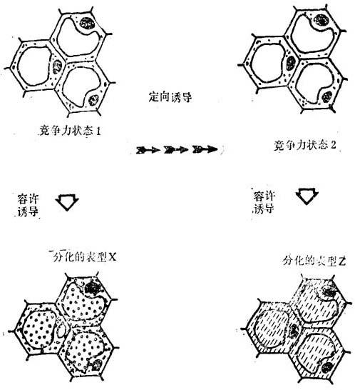 图19-3 一种后生遗传图象 3轴是控制植物代谢概念综合。反应面是植物细胞实际发生的值。发育或代谢变化可视为沿着这种面的移动. 这种3个轴描绘出一种体积,包含着全部代谢产物水平的无牵连的组合。这种体积的表面反应,表明着能实际发生的这类全部组合。这并不是说不会产生某种水平的氨基酸。而是说只有其它代谢产物存在某些水平组合下,能产生某种氨基酸水平。好比原子或分子轨道上有了电子的可得能量水平,才有复合体内代谢产物组诸水平的可能的“景象”,以调节行径。代谢产物浓度是分子方程体系的诸变值,如果有些是独立变值的话,其它一定变成依赖变值。一种代谢产物水平的改变,其它水平被迫变化。 当然,这种观念并非大多数植物生理学家的认识,但是这是动物发育生物学者所信任的传统。这也正是分类学家用于归纳大量调查(野外到试验小区)资料形成分类集团的方式。这种方法学及如何用于植物发育叙述于后。 这类反应面的构成和测验其性质,已产生了对植物代谢动力学的某些明确的和有用的认识。例如,它们阐明了某些后生遗传事项的性质。刻画出合理代谢途径的全部反应的化学平衡方程式,产生一种诸同类方程式系统。这些代谢产物浓度是变值,和速率常数是已知量。这些方程式描绘出全水平的中间和终点产物的生物学可能的组合。这些方程式组的解清可用三向反应面表示,已知具有Eigen值、最大值和最小值。某些最小值是“潜井”。其邻近面是如此陡削,邻近细胞“淹落”到底部,束缚在特定代谢状态。这是组织培养体充分认识的生物合成的自身永存状态,并从植物代谢的数学方式预测取得的。 依据反应面可阐明高等植物细胞全能性性质,以及在相同高等植物细胞定型和决定的共存性。毫无疑问高等植物存在着竞存和决定状态,是否在个体细胞水平也有存在,尚不完全明了。竞存性和决定性是发育状态,以对外界刺激的细胞或组织反应鉴定和表示之。竞存细胞有对一种诱导因素发生反应能力,成为被诱导的;在此条件下,能从一种状态转变成另一种状态。由此必将改变细胞竞存性。如果用相同诱变因素第二次处理,结果使状态2细胞变成状态2细胞,无有可见变化,不能判断这些细胞变成具有竞存性。可是,如果相同诱变剂第二次处理或用另一种诱变剂处理,导致细胞变成状态3,那末它们的竞存性可加以鉴别,由于2→3诱导。 一系列诱导的最后结果,是细胞决定在一种特定发育命运。这类细胞及其有丝分裂衍生物是预定的,能通过形态生长和分化过程,发育成为特定类型的特种细胞、组织或器官。所需要的是“表达它们的细胞表型”的引发。动物发育遗传学家称之为“许可一诱导”,前者是“定向诱导”,诱导竞存性细胞的直线连结。这是能以做到的重别识别。 Waddington(1977)认为决定性常发生于形态改变之前;分子生物学的进展,设想蛋白质和mRNA分子作为某些结构,并证实其存在于导致决定状态过程中。决定性是定向诱导结果,发生于结构改变之前,这是分子改变的直接结果。形态表达和生长是容许诱导结果,引起细胞表达其现实发育命运。二者的区别示之如图19-4。