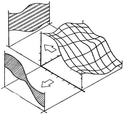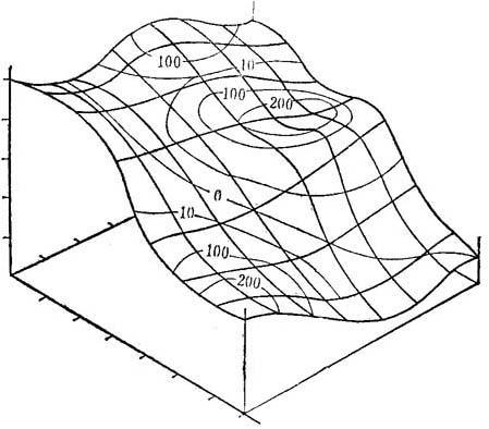图19-2 基因活化分子的分布 (a)在个体细胞内,受体位点局部邻近的基因激活体的浓度,将因细胞而有异以及时间变化而改变。这种“造成”的分布,可用Gausian曲线表示,平均值为M0。将有“造成”的阀值Mt,把细胞分成二群,即具有活化和钝化基因的。 (b)细胞生理学变化,能使“造成”平均值从M0变迁到M′。围绕新平均数的分布,将保持Gausian曲线,结果是具有钝化(或活化)基因的细胞数增多(或减少)。这种图解指出一种小改变;一种大改变将发生相应的较大效应。 每个基因受若干因子组活化的若干基因的发育体系,不过是把这种“造成”的单向顺序,扩大成三向反应面。涉及的控制基因活化的全部参数,可分成3种结构变值,瓶内或组织内诸细胞内代谢状态的分布,以三向反应面代表之(图19-3)。Waddington(1977)描述了这类表象,叫“后生界面”,确属如此。它们是控制基因作用活一钝的细胞代谢状态(后生基因)的分布。