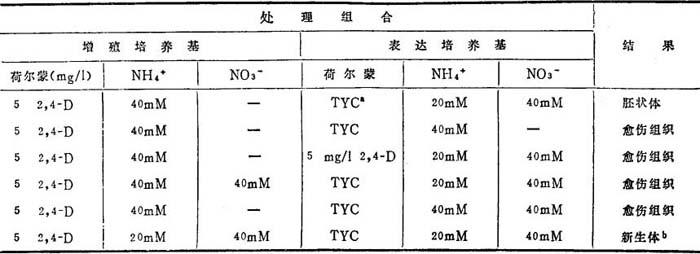 图19-5 容许诱导产生后生遗传图景的地形投影图 容许诱导对一组细胞生理的影响,可视作在平面上的二向反应面。从一个角度投影一个形,当沿着不同轴投影时,产生另一个形。这与植物细胞培养的2种不同容许诱导的不同后果相符:一种类型的紫苜蓿培养体转移结果产生胚状体,另一类型转移结果是根。 容许诱导性质是被动的;它使或容许对特种容许诱导剂发生反应的那些细胞发育状态的表达。定向诱导不是被动的;它使竞存性细胞从状态1转变成状态2。 (二)大豆胚性培养 由已知种产生体细胞胚状体的一系列操作方法的建立,尔后视细胞竞存性对容许诱导刺激的反应,产生体细胞胚状体,这种胚性培养与前述方法并无差别。但可分别启动培养状态和分别操作。 许多情况下,人工培养愈伤组织发育成不同表型。这些表型如“湿”、“粗糙”、“硬”、“紧密”和“玻璃质”,能继代在相同培养基上。它们能反映出不同发育潜势。例如,Tom Orton(1979)从大麦未成熟胚珠培养体产生的五种不同愈伤组织表型,观察到其中之一具有显着再生植株潜力。肉眼选择和培养这种表型变异体愈伤组织产生的培养体,用常规程序取得高效植株再生。 尽管各种豆科植物从外植体、愈伤组织或悬浮培养体已取得茎叶或再生植株成功,大豆细胞培养属已有报道,仅限于从下胚轴片段产生茎叶,复子叶芽和不完全体细胞胚胎发生。Phillips等(1981)和Gamborg等(1983)报道大豆培养体已能形成具有规律发育的体细胞胚状体,直到鱼雷形后期。最近Jack Widholm等(1983)从G.canesceus愈伤组织培养体形成茎叶。Christianson等报道是唯一的从G.max再生植株成功之例。从G.max cv、Mitchell2.5-3.0cm大豆荚取幼胚启动愈伤组织,除去子叶,将胚轴切成1-2mm片段,培养在MS+5mg/l2,4-D。诱导产生愈伤组织。几周后,取松脆部分转入新鲜培养基,仍加5mg/12,4-D。1个月后,继代在MS+2mg/1 IAA和0.2mg/l2ip,培养在低光强下约3个月。观察到许多愈伤组织表型,从白色松脆型到光滑、绿色、玻璃质型。后者象高度不正常胚轴1叫“新效形”(newmorphs)。将萱草新效形培养在加和不加2,4-D培养基一次循环,发育成高度形态建成的萱草培养体。当然这是Steward(1964)用野生胡萝卜培养体的研究:从第一次循环取胚,切成薄片,重复这种过程。采用相似轮回选择方案取得了大麦高度生根系和棉花形态建成培养体。大豆轮回选择的培养体,对不加2,4-D的反应,重现了新效体。培养3年后,细胞系继续形成胚状体,根和茎叶生长平衡。并无发育成真正的胚。并取得了具有形态建成竞存性的培养体,但其启动,容许诱导剂不怎样确切。扩大已用的物理性隐喻,好像三向反应面并非在平面上投影,但在斜面上投影的,在形虽在,轮廓已非。 Wernicke等(1982)把高粱或还有其它种的胚性培养体增殖体保持在小集团抑制原基状态。认为高水平2,4-D抑制分化或形态表达在竞存性状态。但是,已有足够论据,指出可从其它途径产生形态竞存性的抑制,相反,可由几方面启动。竞存性培养体产生体细胞胚。除去2,4-D可以完成,改变氮水平和改变细胞密度也能启动胡萝卜培养体的体细胞胚胎发生。这些启动途径,即使在显着量2,4-D下,将能产生胚状体。 紫苜蓿培养体体细胞胚胎发生需要高水平2,4-D,和转入不加2,4-D表达培养基启动之。Stuart等报道了NH4+和还原氮对紫苜蓿体细胞胚胎发生的促进效应。指出即使在适于发根的荷尔蒙范围内,高水平NH4+促进体细胞胚发育。Christianson等研究另一属的茎叶器官建成,有力地指出氮源对人工培养形态建成控制有关键作用。如果用柠檬酸铵,可全用NH4+,保持培养基的pH值。用20mM二碱基柠檬酸铵代替MS的40mM NH4+和20mM NO3-,诱导盖满许多小胚状体的半片组织。将这半片移入MS+5μg/l IBA和200μg/1 BAP发育成完整的体细胞胚,产生带有几个伸长节间的再生植株。放在柠檬铵2,4-D培养基进一步增殖,产生颗粒状悬浮培养体,并经系列继代而保持之。当将这种培养体从含2,4-D的“增殖培养基”移入无2,4-D的标准MS盐类表达培养基时,保留了形成胚状体能力。同样培养体仍能产生体细胞胚。用加和不加2,4-D再次循环培养,肉眼选择发育完整幼胚状体,切片,再培养在“增殖培养基,结果产生一种培养体,将能产生具有叶柄的子叶的体细胞胚,几乎确切地模拟着合子胚的子叶。由此产生根和茎叶平衡生长的再生植株。虽已成为常规操作,但效率仍不高。目前采用表达培养基:40g/l蔗糖,不加荷尔蒙。ABA或GA3、脯氨酸并无需要和助益。 (三)容许诱导 Christianson等把大豆培养物培养在不加2,4-D和以40mM NH4+代替MS的NH4+和NO3-,产生体细胞胚胎发生。指出单纯除去2,4-D,不足以启动大豆培养体的体细胞胚胎发生:把柠檬酸铵2,4-D培养体中的形态建成悬浮体转入柠檬酸铵无2,4-D培养基,结果并未产生胚状体和发育。 改变氮源是重要的。2,4-D+标准MS盐类,取得了形态建成悬浮体的亚系。转入表达培养基1周后产生少数反常胚状体。在标准MS盐类上4周后,转入表达培养基,产生透滑的绿色结构,但全无胚状体。最近研究晚期形态建成培养体,每周选择蜡质,黄-绿色、“胚原片”,除去快速生长的松脆白色愈伤组织,后者是培养在MS标准盐类上产生的,能延长胚性竞存性培养体。 含有40mM硝酸钾和柠檬酸铵增殖培养基,以及MS盐类加20mM柠檬酸铵,都有不利效应。反之,表达培养基中加20mM柠檬酸钾,并不能停止产生体细胞胚。有