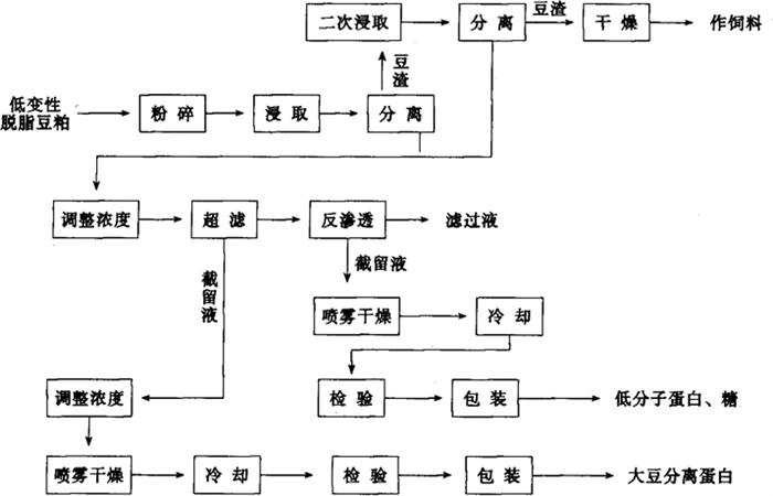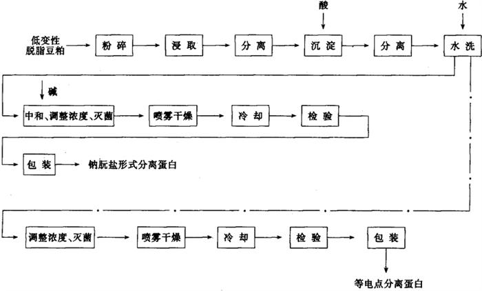 | 释义 | 大豆分离蛋白加工装备 1 概述 分离蛋白又称等电点蛋白粉,它是将脱壳脱脂的大豆进一步去除所含非蛋白质成分后,所得到的一种精制大豆蛋白产品。与浓缩蛋白相比,分离蛋白中不仅去除了可溶性糖类,而且要求除去不溶性聚糖,因而蛋白质含量高(不低于90%),但其得率相应也低(约35%~40%)。在制取分离蛋白中所需的装备即为大豆分离蛋白加工装备。大豆分离蛋白加工工艺主要有稀碱液浸取后机械分离或膜分离两种。目前国内仍以前者为主。 2 加工工艺(图1-14-39和图1-14-40)