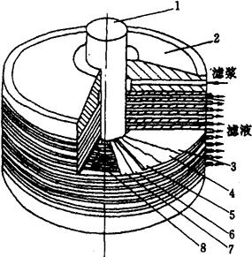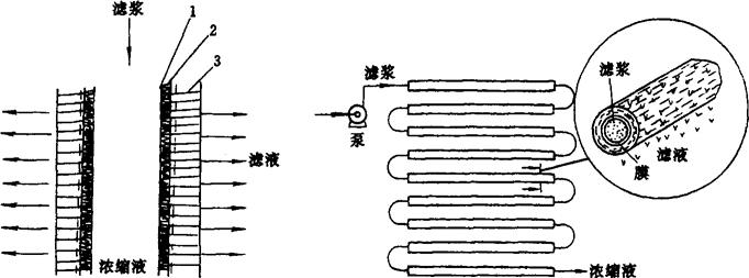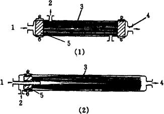 图1-14-41 平板式膜组件(DDS模块) 1-中心轴 2-盖板 3-膜 4-滤纸 5-膜支撑板 6-滤纸 7-膜 8-垫片 (2)管式膜组件(图1-14-42) 管式组件主要是把膜和支撑体合在一起制成管状,再将一定数量的管以一定方式联成一体而组成。按膜附着在支撑管的内侧或外侧可分为内压管式和外压管式组件。按管式组件中膜管的数量又可分为单管式和列管式两种。管式组件的优点是流动状态好、流速易控制,适当控制流速可防止或减小浓差极化,安装、拆卸、换膜和维修均较方便。由于支撑管径相对较大(一般在0.6~2.5cm),所以可处理含悬浮团状体的溶液。与平板式组件相比,单位体积内有效膜面积较少。